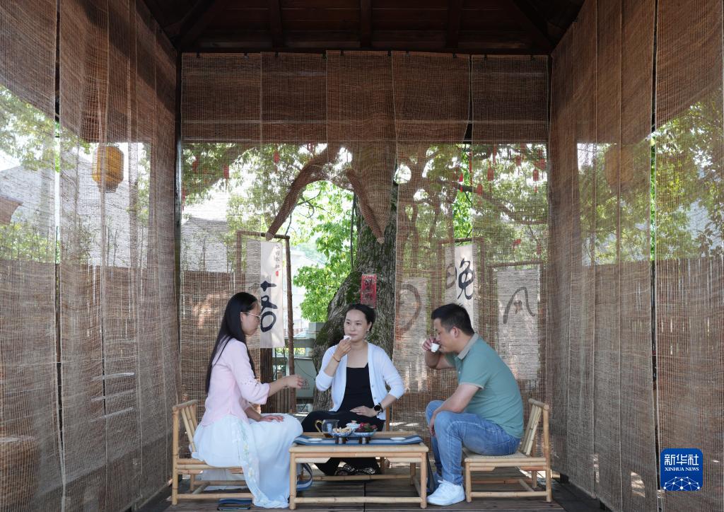 人們在浙江紹興上虞區驛亭鎮白馬湖畔的茶社喝茶(6月9日攝)。當地對公園提檔升級,引進“春暉茶社”,促進集體經濟增收。