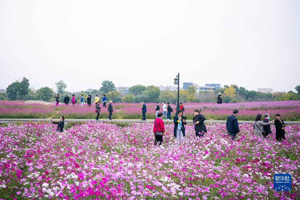 游客在浙江杭州余杭區徑山鎮游玩賞花(2022年10月28日攝)。