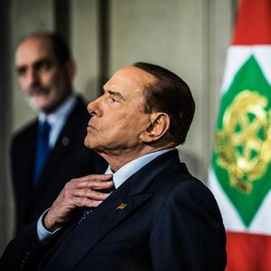 這張資料照片顯示的是,2018年4月12日,意大利前總理貝盧斯科尼在羅馬出席記者會。