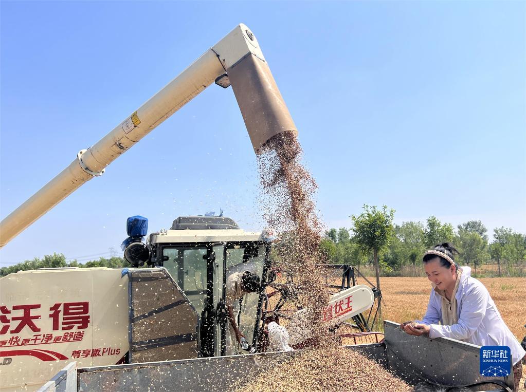 6月11日,山東省濱州市沾化區泊頭鎮在鹽堿地上試種的1100畝黑小麥開始收割。