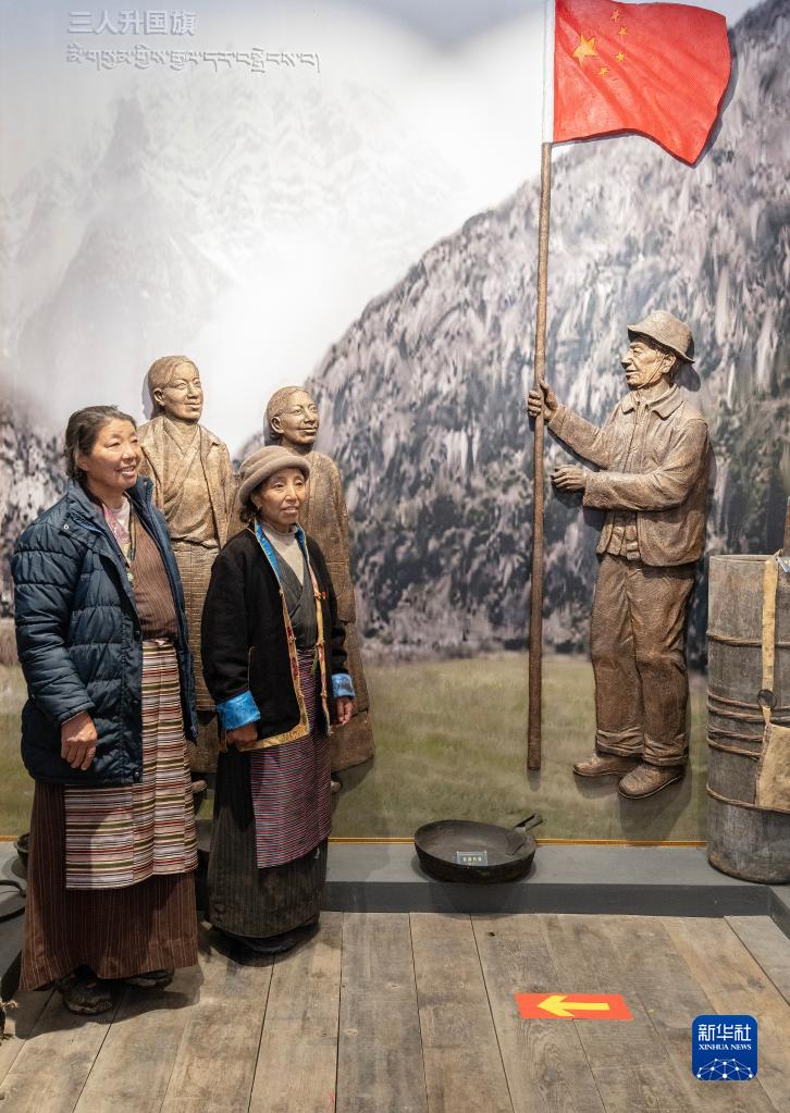 6月10日,卓嘎(右)和央宗在桑杰曲巴故居中與描繪桑杰曲巴用自己縫制的國旗舉行升旗儀式場景的壁畫前合影。