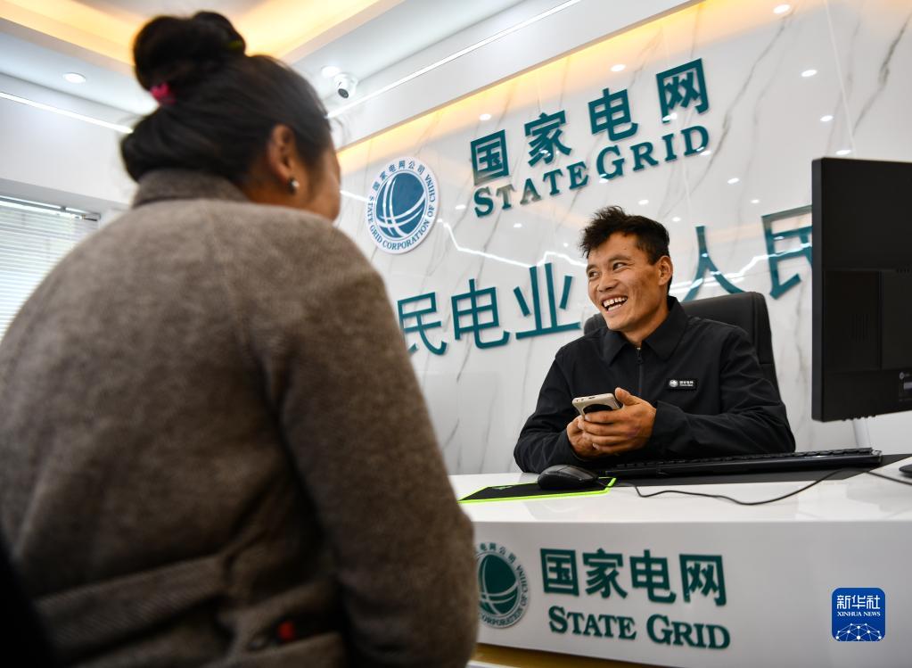 玉麥鄉國家電網工作人員丹增桑珠為顧客充電費(6月10日攝)。