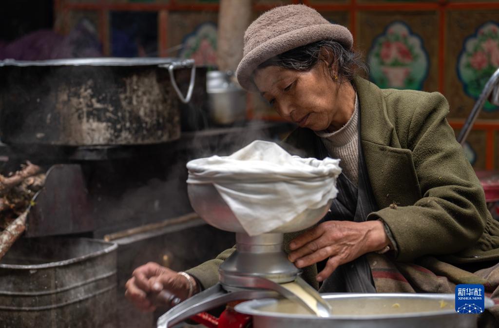6月10日,卓嘎在牧場的小屋里制作酥油。
