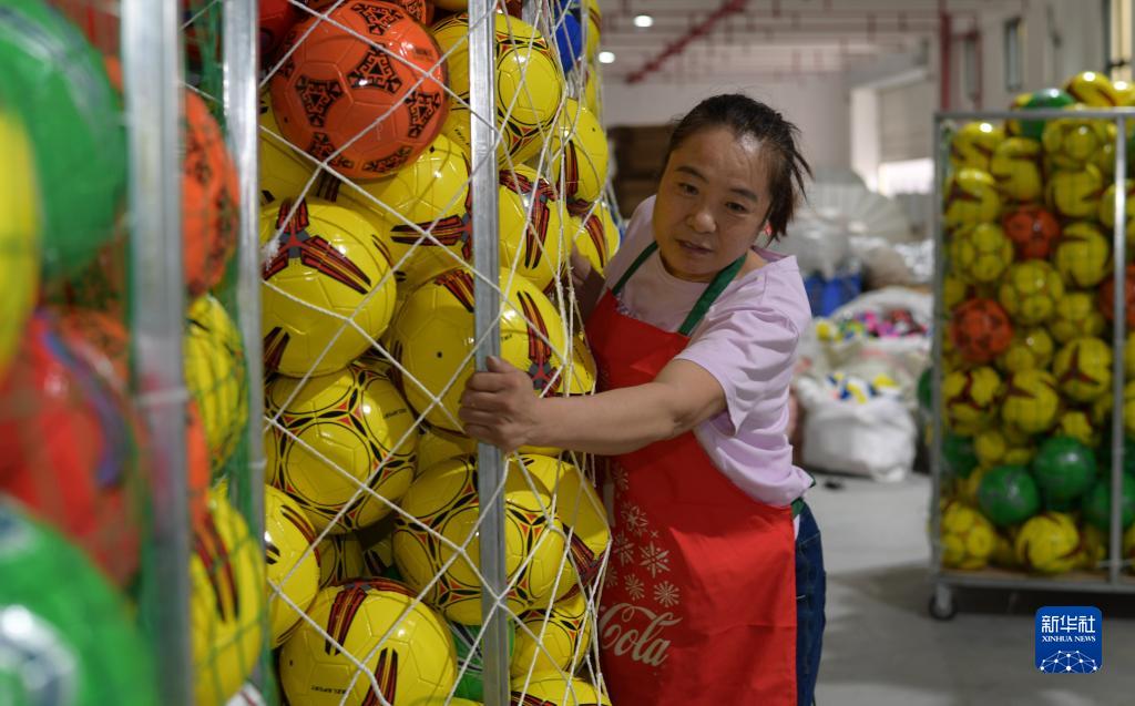 6月12日,工人在鳳岡縣一足球生產企業搬運成品足球。