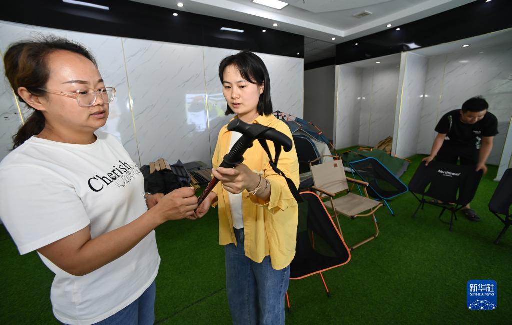 6月12日,鳳岡縣一戶外產品生產企業工作人員(中)給客戶介紹產品。