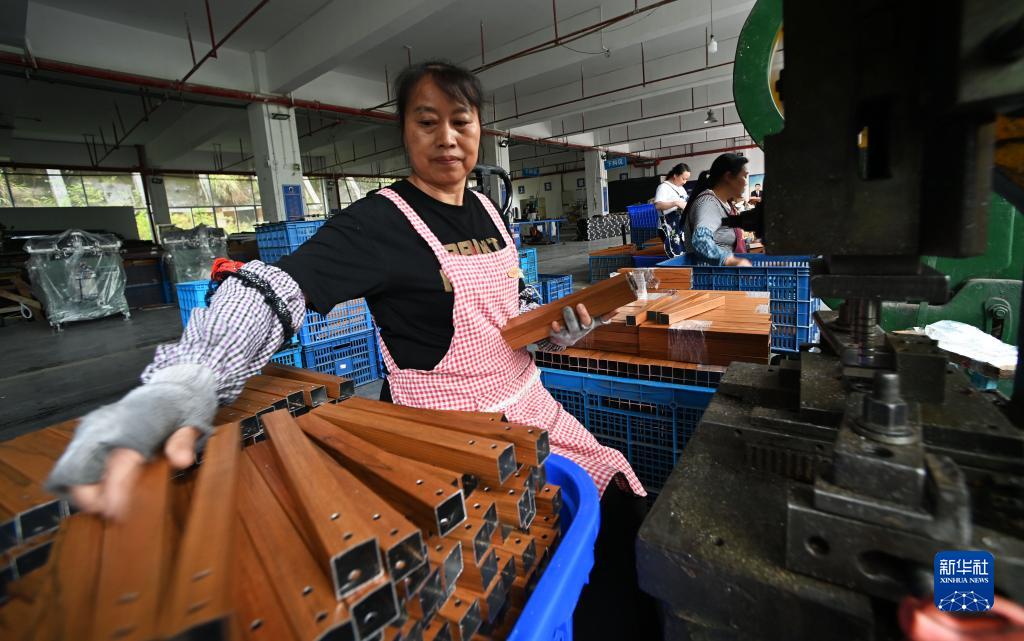 6月12日,工人在鳳岡縣一戶外產品生產企業加工生產便攜坐椅組件。