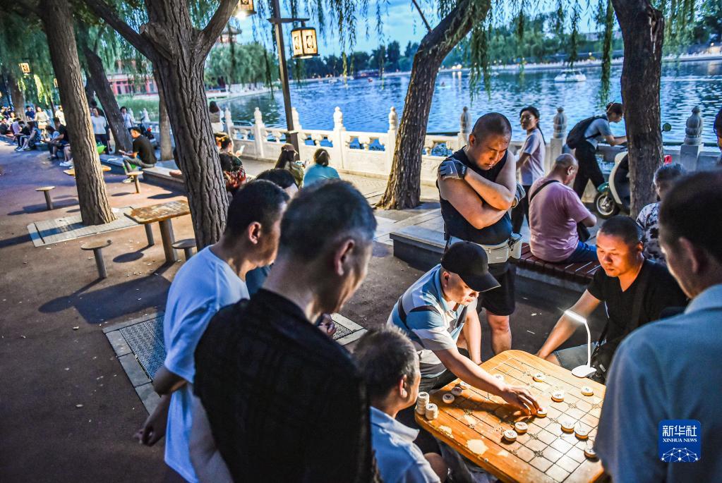 6月10日,市民在北京什剎海邊下棋。新華社記者 陳鐘昊 攝