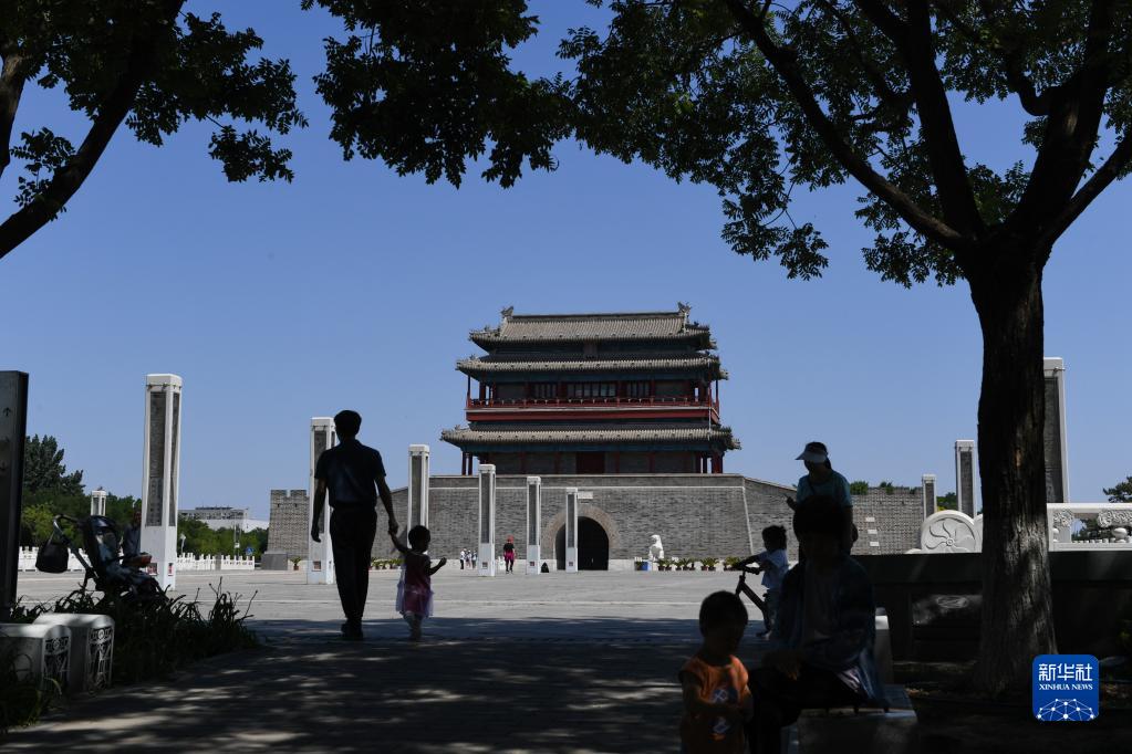 6月6日,人們在北京永定門公園的永定門城樓前玩耍。新華社記者 鞠煥宗 攝