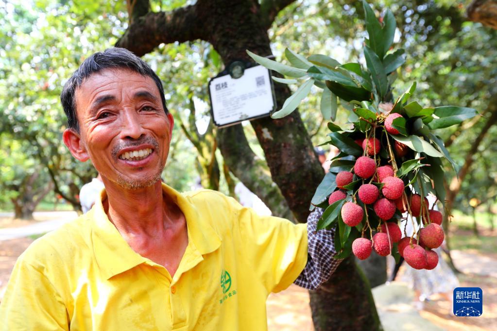 6月12日,在廣東茂名高州市根子鎮柏橋村荔枝種植園,一位果農展示從樹齡約1300年的“天倫之樂”古樹上采摘的荔枝。
