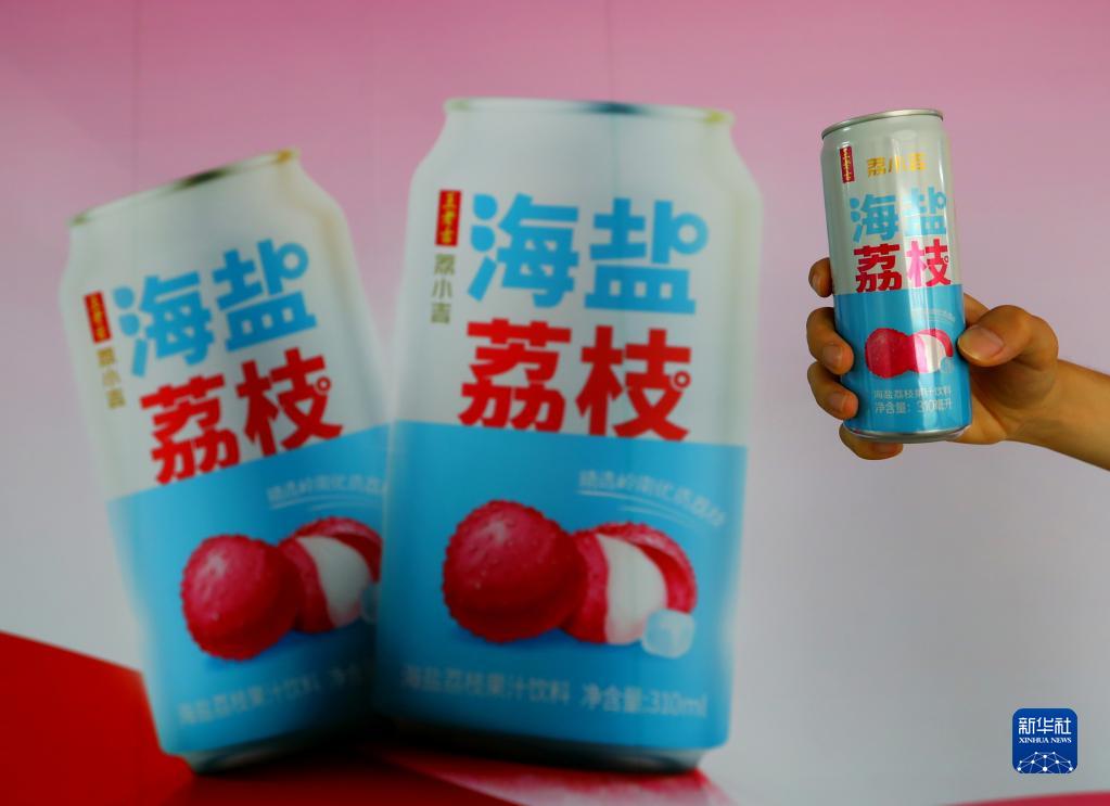 這是6月12日在廣東茂名的廣藥王老吉廣東荔枝(茂名)產業園拍攝的荔枝果汁飲料(左側為海報,右側手中為實物)。這里的荔枝清汁生產線每天可處理200噸荔枝鮮果。