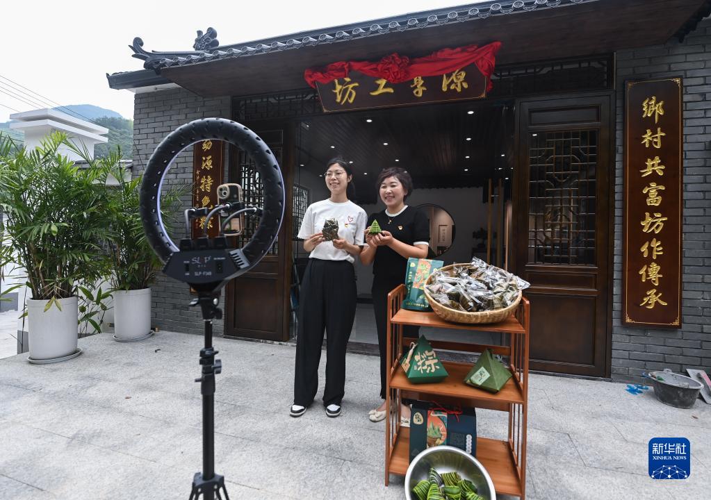 6月13日,在杭州市富陽區湖源鄉窈口村的“源享共富工坊”的展示館外,當地黨員志愿者直播推介灰湯粽。