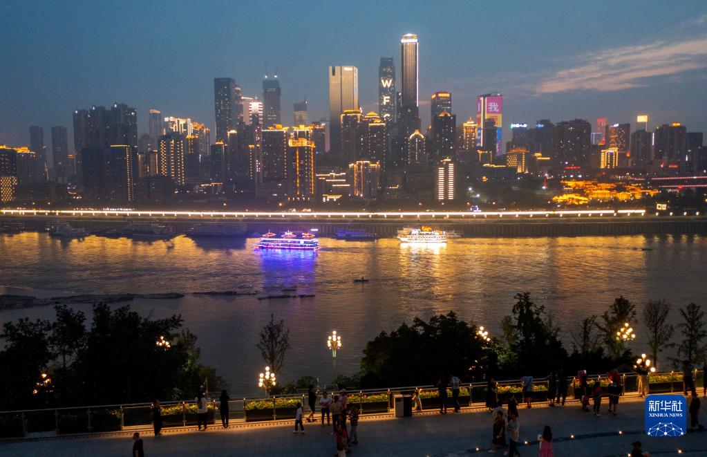 6月9日,重慶開埠遺址公園的觀景平臺上,游客們在欣賞重慶夜景(無人機照片)。