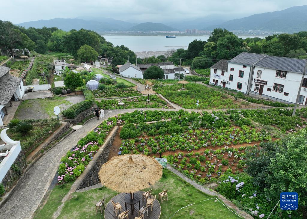 6月13日,人們在強蛟鎮一處花海景觀游覽(無人機照片)。