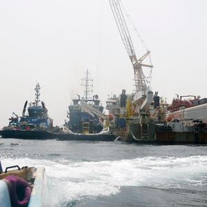 這是6月12日在也門荷臺達附近海域拍攝的“薩菲爾”號油輪和聯合國工程船。