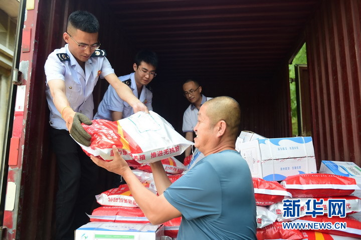 6月13日,黨建聯建活動上稅務人員為農民送去生物飼料。新華網發(常征 攝)