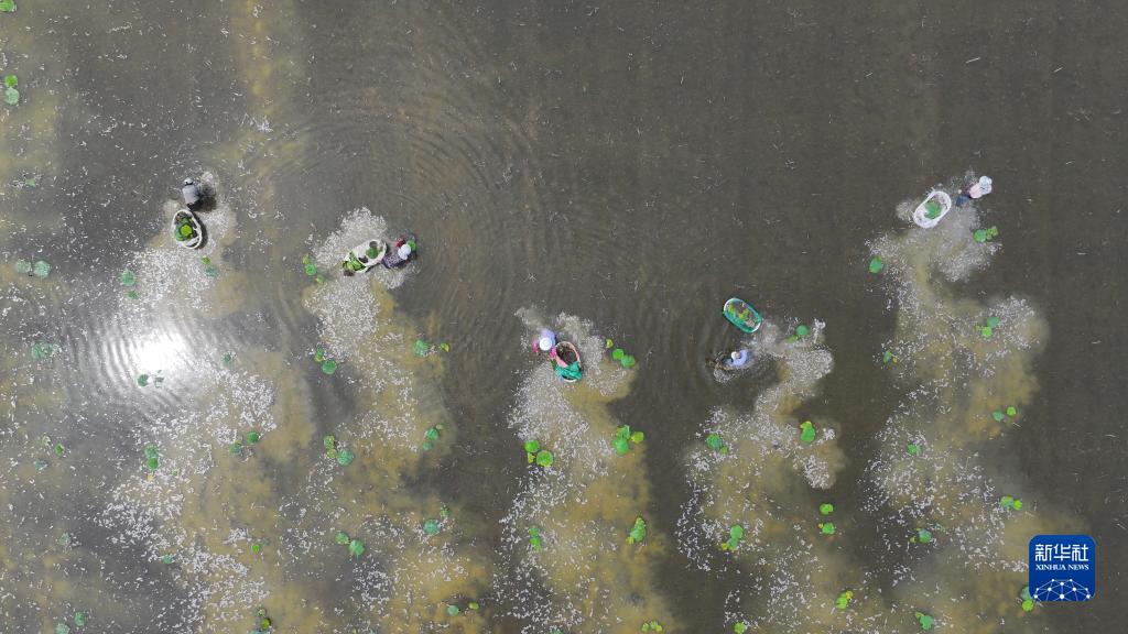 6月13日,江蘇省淮安市洪澤區岔河鎮農民在田間移栽芡實秧苗(無人機照片)。