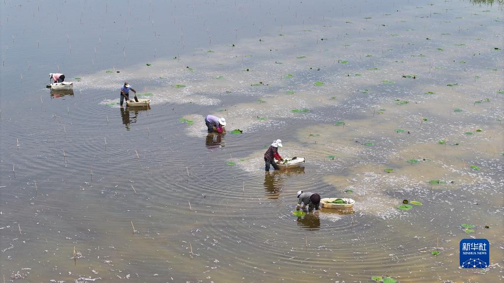 6月13日,江蘇省淮安市洪澤區岔河鎮農民在田間移栽芡實秧苗(無人機照片)。