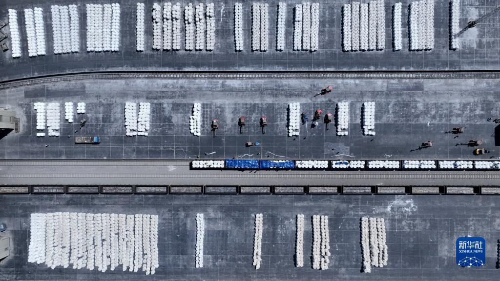6月12日,在青海鹽湖工業股份有限公司鉀肥分公司貨場,工作人員在裝運鉀肥(無人機照片)。