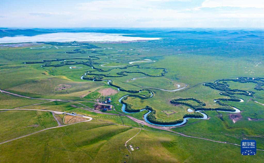 初夏時節,位于內蒙古自治區錫林郭勒盟東北部的烏拉蓋草原風景宜人,蔚藍色的天幕下,綠色的草原廣闊無垠,蜿蜒流淌的烏拉蓋河綿延向遠方,美如畫卷。