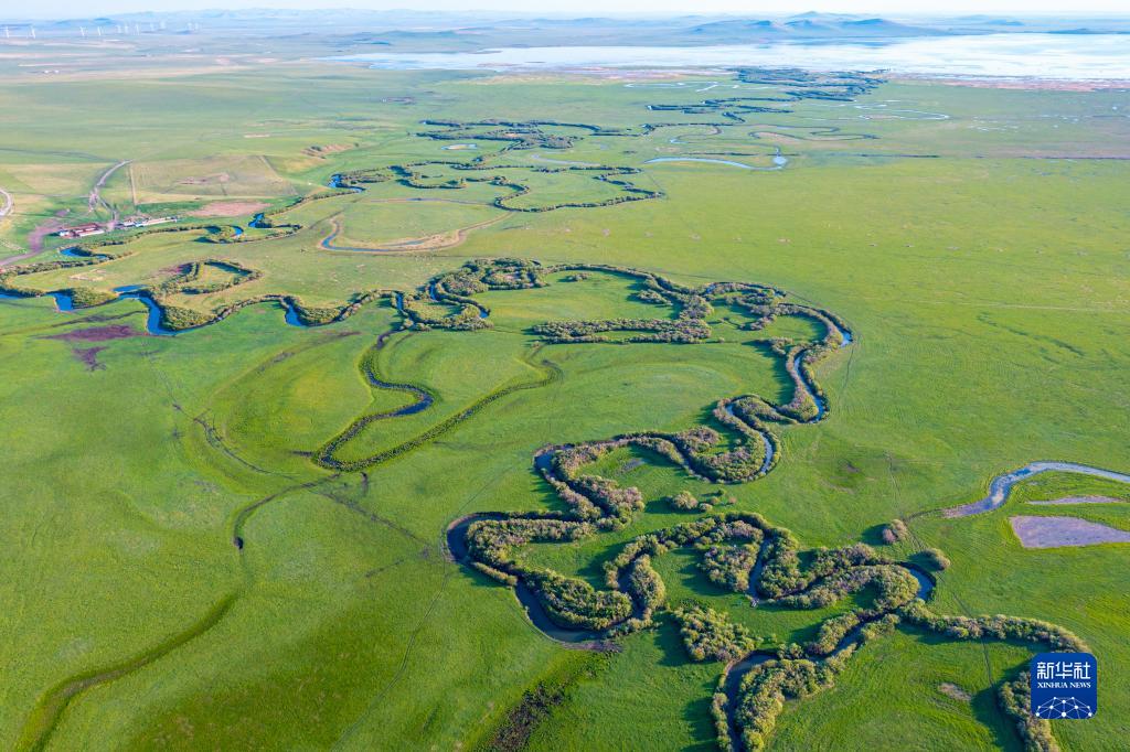 初夏時節,位于內蒙古自治區錫林郭勒盟東北部的烏拉蓋草原風景宜人,蔚藍色的天幕下,綠色的草原廣闊無垠,蜿蜒流淌的烏拉蓋河綿延向遠方,美如畫卷。