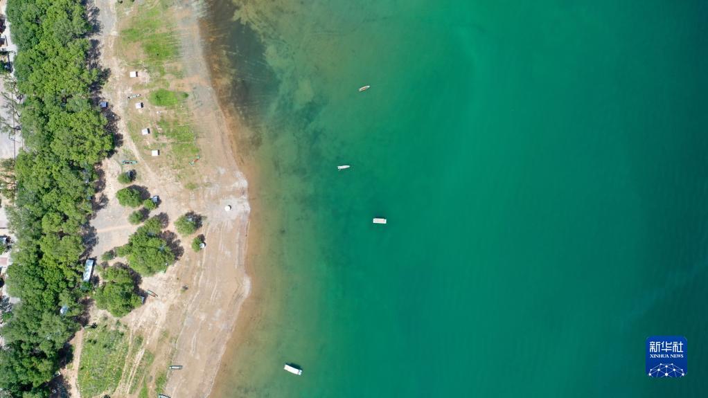 位于甘肅省臨夏回族自治州永靖縣境內劉家峽水庫的黃河三灣碧波蕩漾、岸線蜿蜒,片片小舟在水面搖曳,呈現一幅夏日清新畫卷。