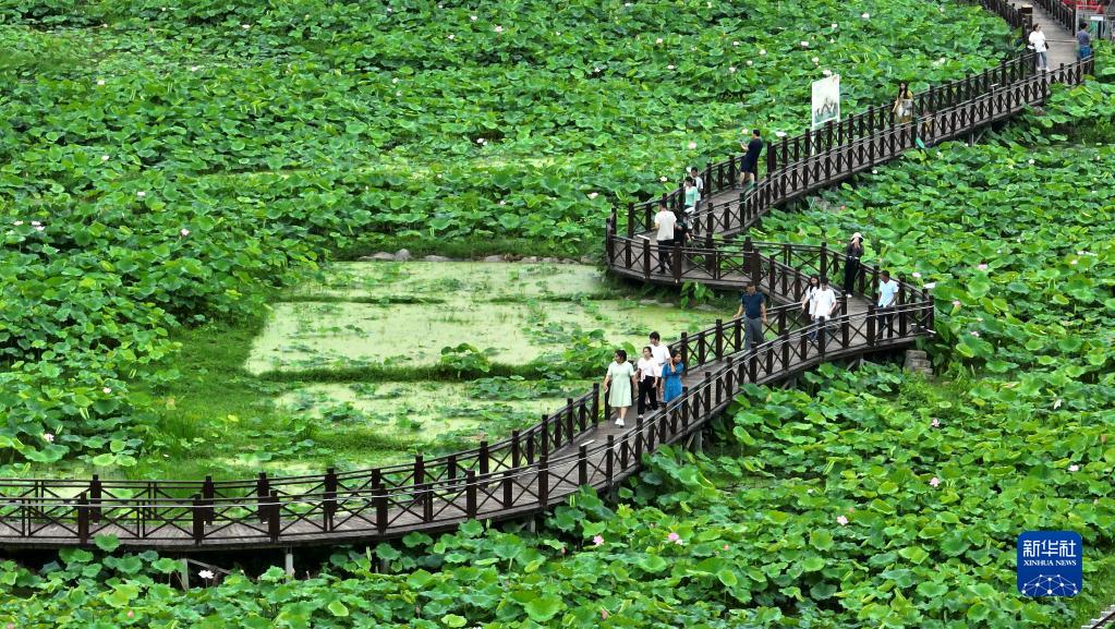6月13日,游客在柳州市柳江區百朋鎮萬畝荷塘里游覽(無人機照片)。