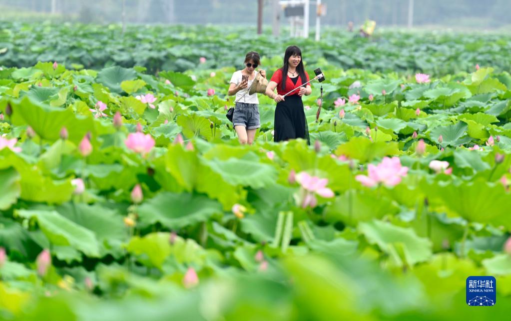 6月13日,游客在柳州市柳江區百朋鎮萬畝荷塘里游玩。