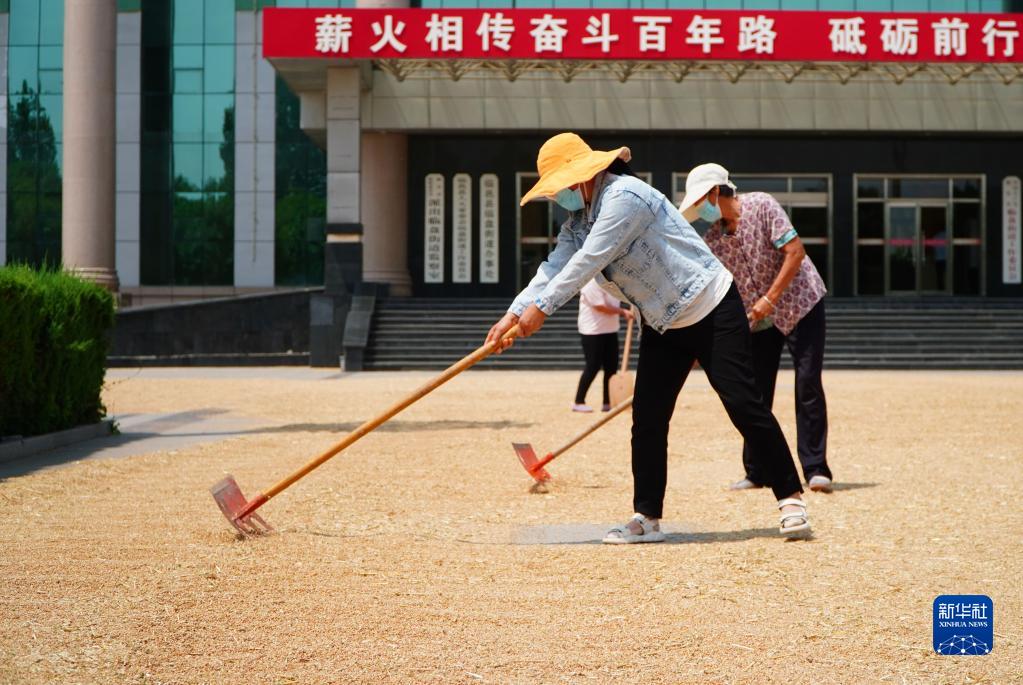 6月13日,農戶在臨邑縣臨盤街道政府大院曬糧。