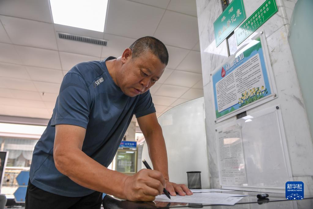 6月13日,在長春市中心血站,RH陰性血無償獻血志愿者王文東在獻血前填寫個人信息。