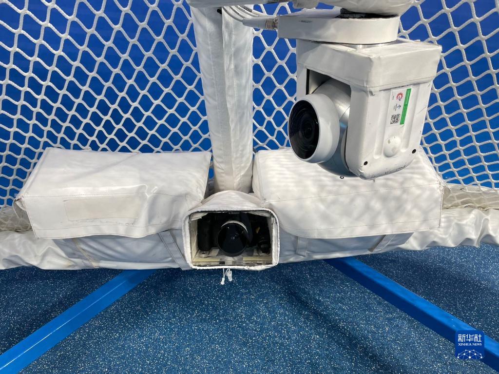 圖為北京2022年冬奧會男子冰球賽場球門內安裝的遙控相機(2022年1月22日攝)。