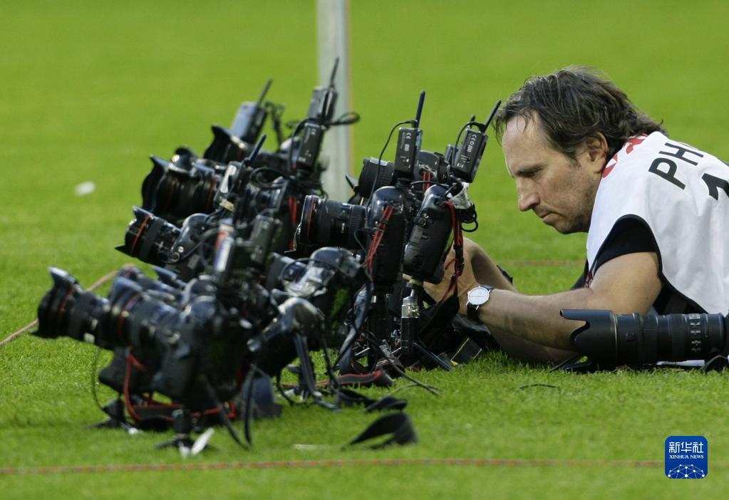 圖為一位攝影記者在2008年歐洲杯賽場球門后架設遙控相機(2008年6月18日攝)。
