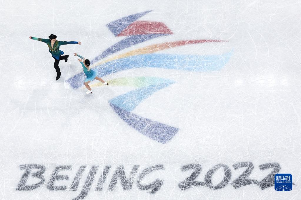 圖為中國選手王詩玥(右)和柳鑫宇在北京2022年冬奧會花樣滑冰冰上舞蹈自由舞比賽中(2022年2月14日攝)。