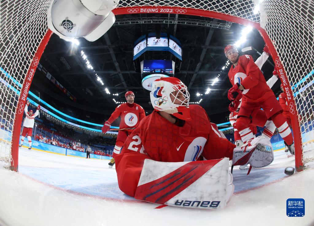 圖為俄羅斯奧委會隊守門員(前)在北京2022年冬奧會男子冰球四分之一決賽中(2022年2月16日攝)。