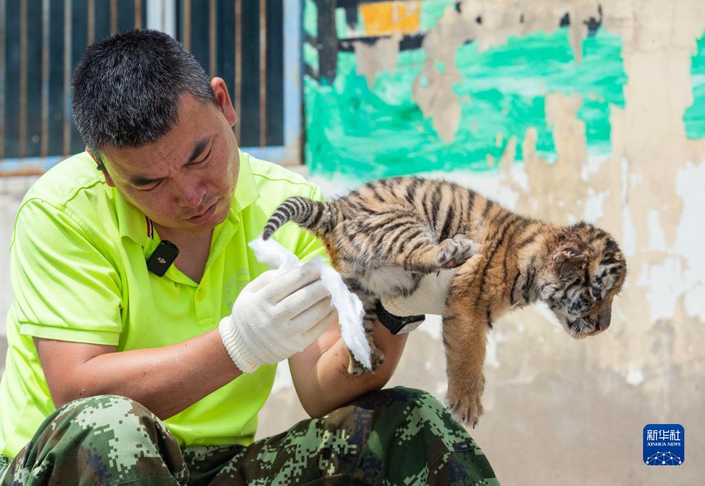 6月13日,在黑龍江東北虎林園,飼養員在清潔東北虎幼崽。
