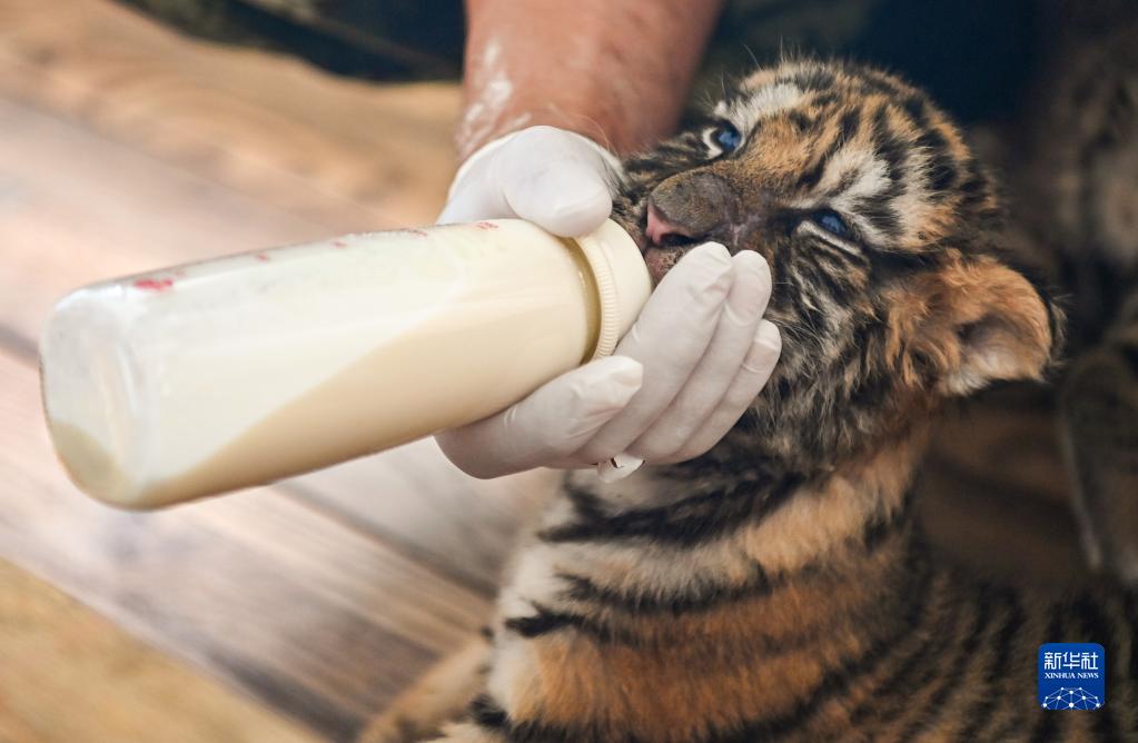 6月13日,在黑龍江東北虎林園的虎舍中,飼養員給東北虎幼崽喂奶。