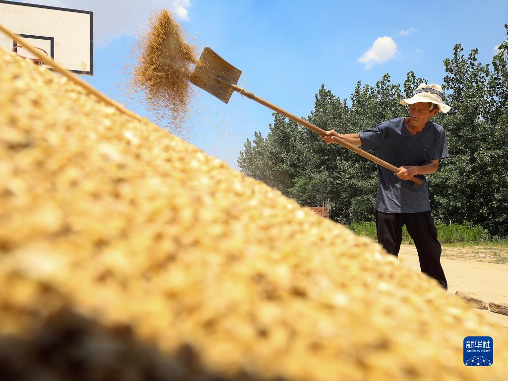 6月13日,在河南省安陽市安陽縣韓陵鎮西目村,村民在村籃球場臨時晾曬點翻曬麥子。