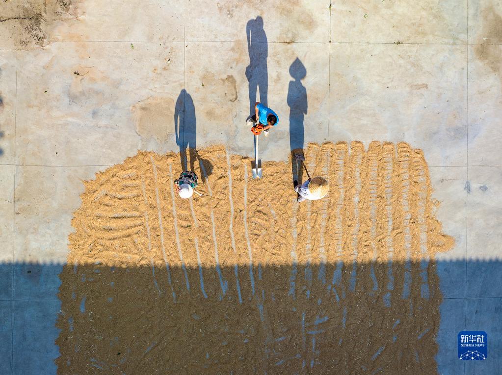 6月13日,在河南省安陽市湯陰縣古賢鎮支村黨群服務中心臨時晾曬點,村民在晾曬麥子(無人機照片)。