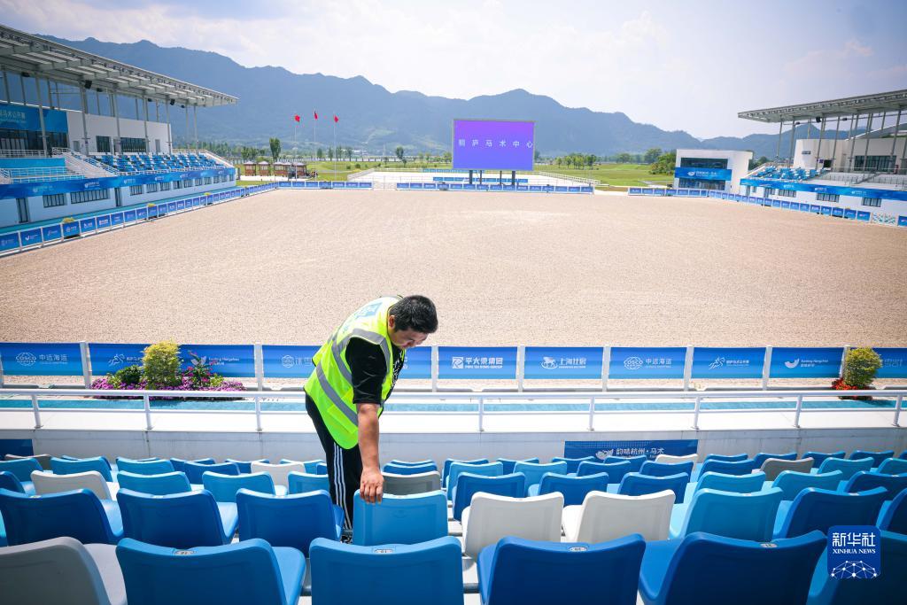 6月9日,汪祥在桐廬馬術中心巡查看臺區域時檢查座椅。