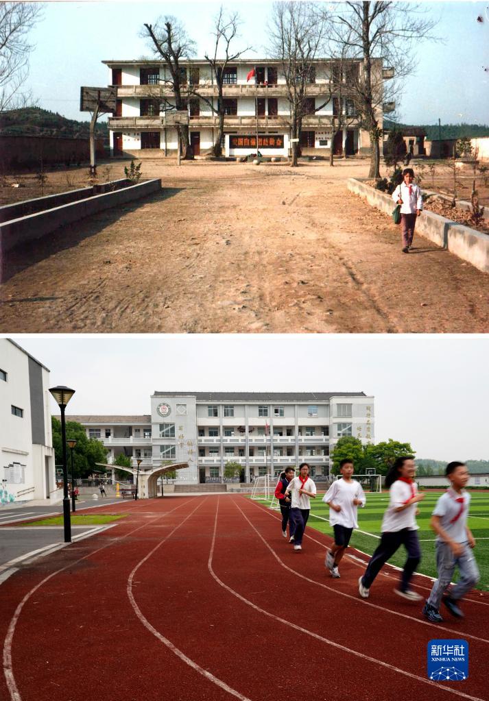 拼版照片:這是在鄣吳村同一地點拍攝的原安吉縣鄣吳鄉中心小學(上圖,王光法1987年攝)和安吉縣昌碩小學(下圖,新華社記者韓傳號2023年6月13日攝)。