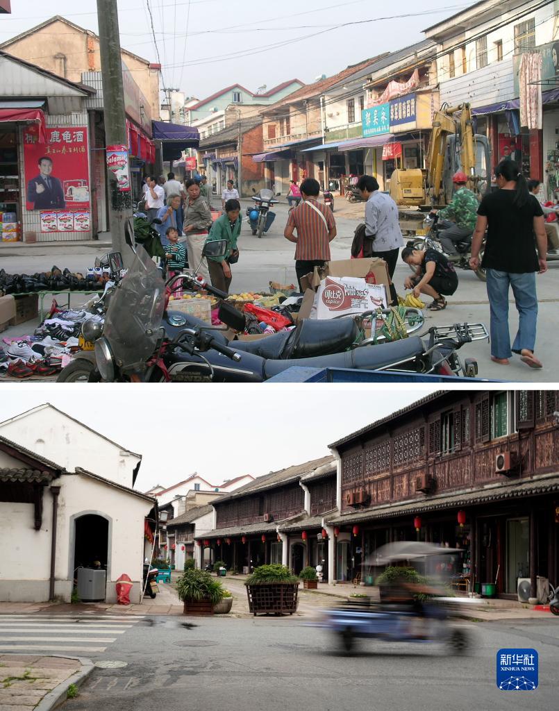 拼版照片:這是在安吉縣鄣吳鎮鄣吳村拍攝的歸仁里老街十字路口(上圖,王光法2009年攝;下圖,新華社記者韓傳號2023年6月13日攝)。