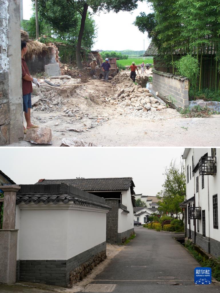 拼版照片:這是在同一地點拍攝的安吉縣鄣吳鎮鄣吳村景觀(上圖,王光法2000年攝;下圖,新華社記者韓傳號2023年6月13日攝)。