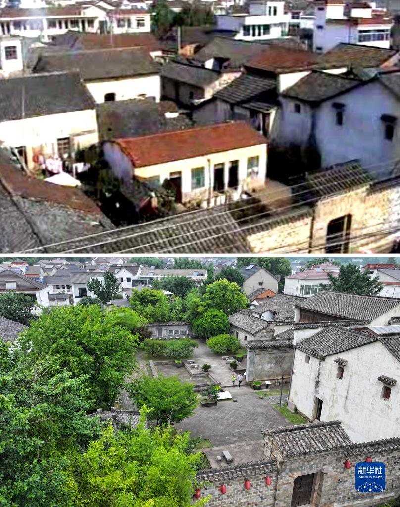 拼版照片:這是安吉縣鄣吳鎮鄣吳村吳昌碩故居(上圖,視頻截圖,王光法2001年攝;下圖,無人機照片,夏鵬飛2023年6月13日攝)。