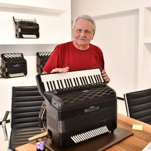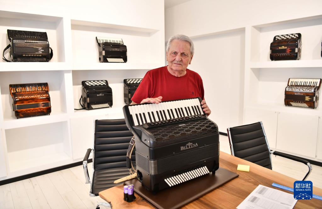 5月29日,在意大利卡斯特爾菲達多,貝爾杜納品牌創始人阿納爾多·門加希尼展示該品牌設計生產的一架超輕碳纖維材質手風琴。