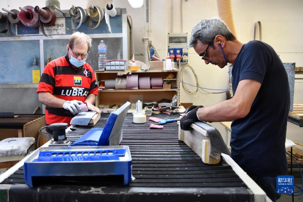5月29日,在意大利卡斯特爾菲達多,貝爾杜納品牌手風琴工匠打磨手風琴部件。