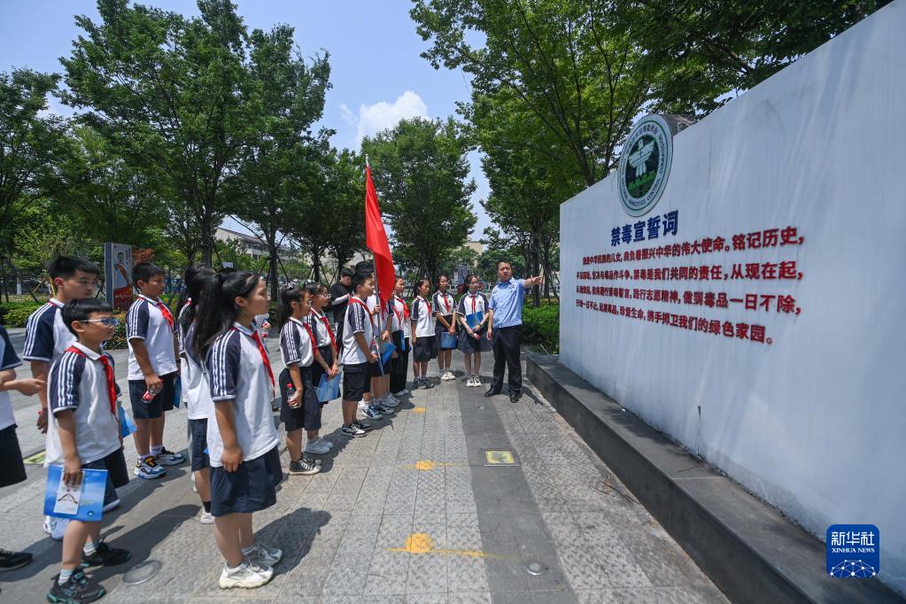 在第36個國際禁毒日來臨前,浙江省湖州市吳興區織里鎮織北派出所民警在織里鎮禁毒主題公園為湖州市織里實驗小學的師生開展禁毒主題宣傳活動。