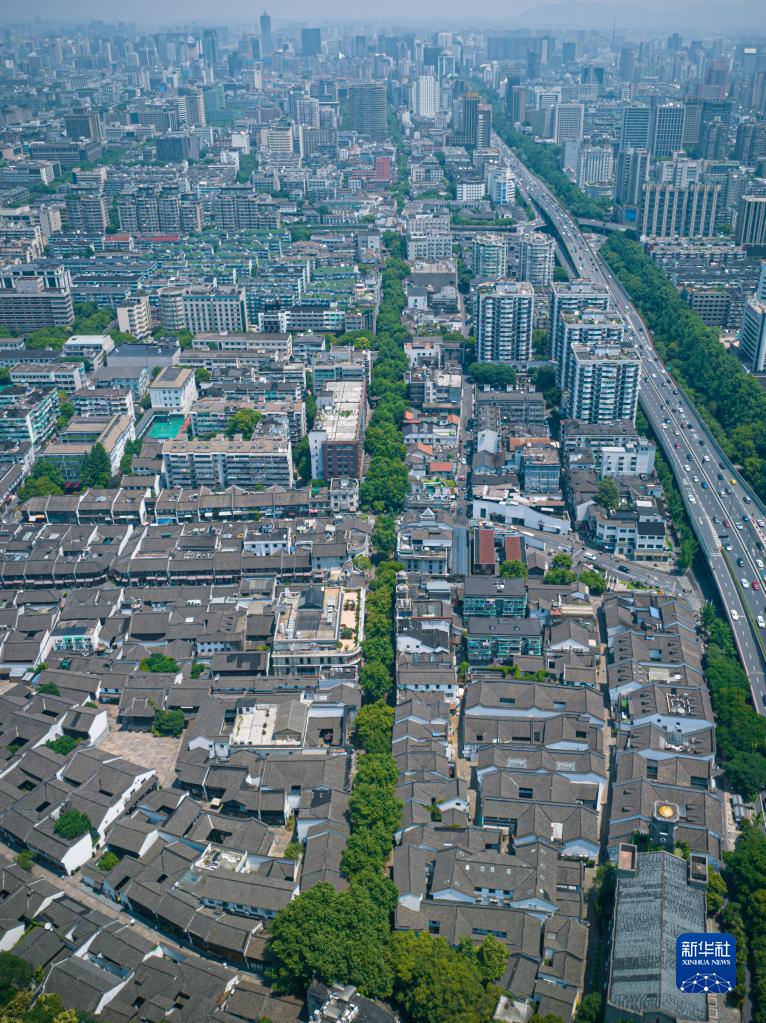 這是6月10日拍攝的綠樹成蔭的南宋御街步行街(無人機照片)。