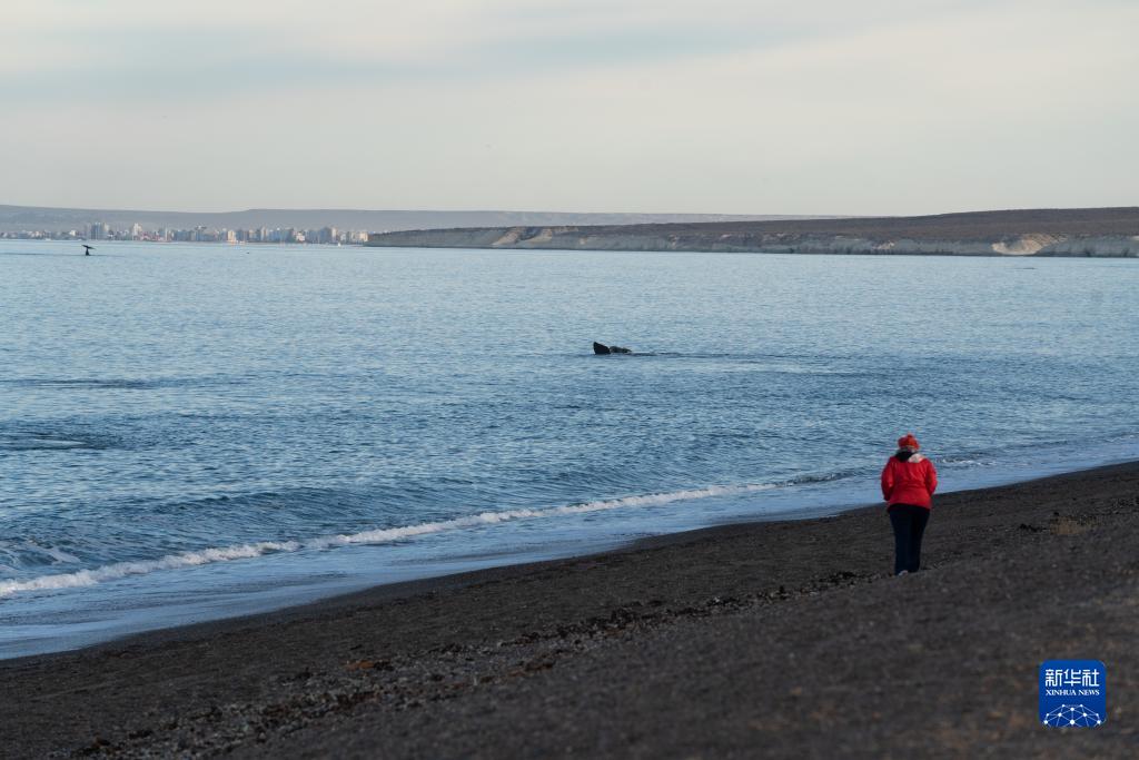 6月13日,在阿根廷馬德林港,游客在海灘上觀賞南露脊鯨。