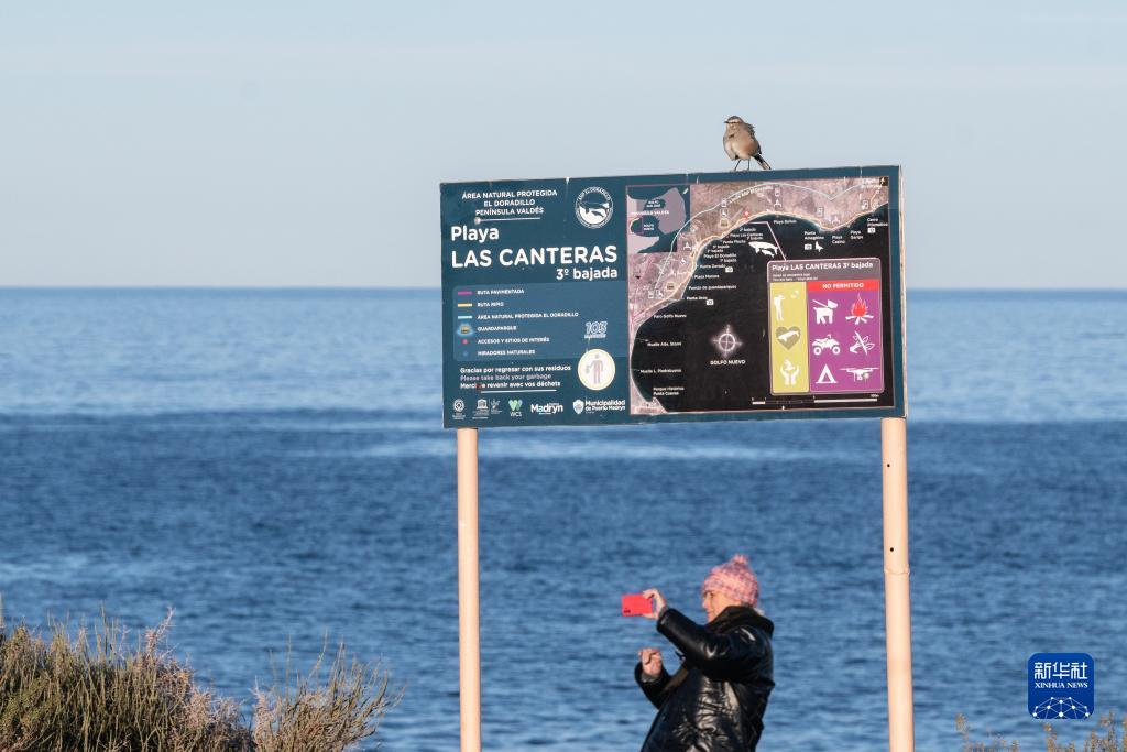 6月13日,游客在阿根廷馬德林港一處可觀賞鯨魚的海灘前拍照。