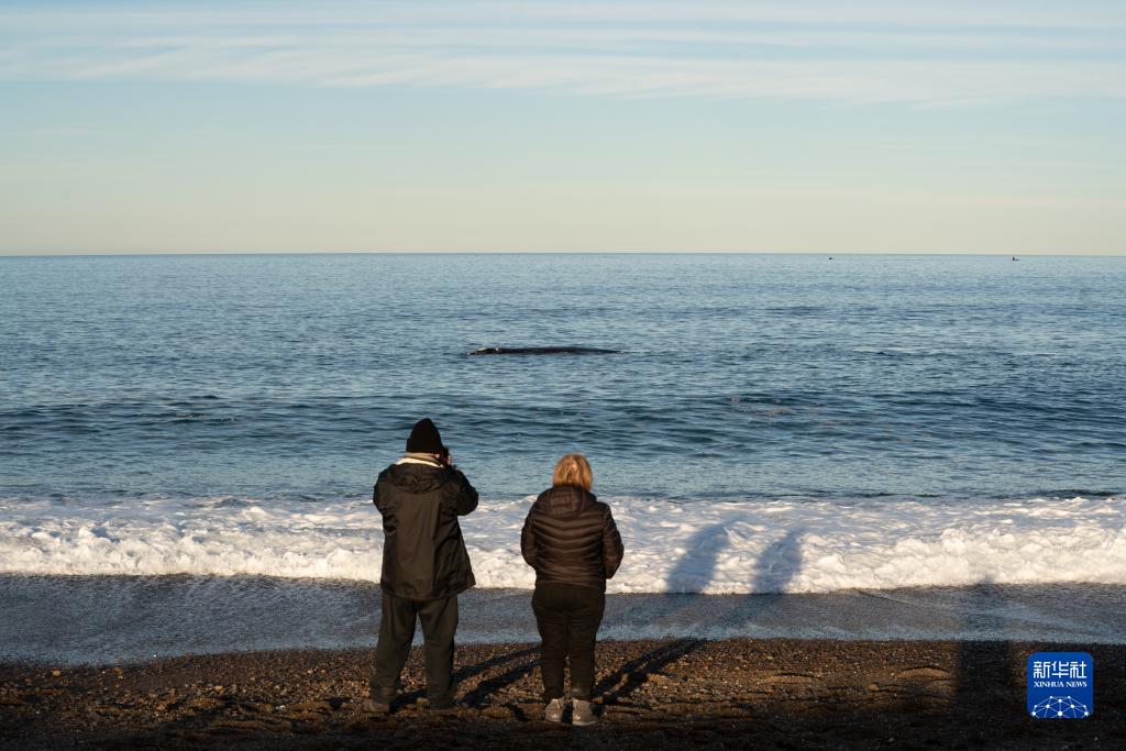 6月13日,在阿根廷馬德林港,游客在海灘上觀賞南露脊鯨。
