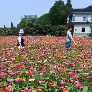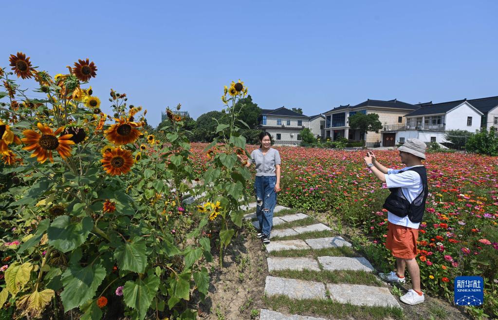 6月14日,游客在織里鎮廟兜村的花海里拍照留影。